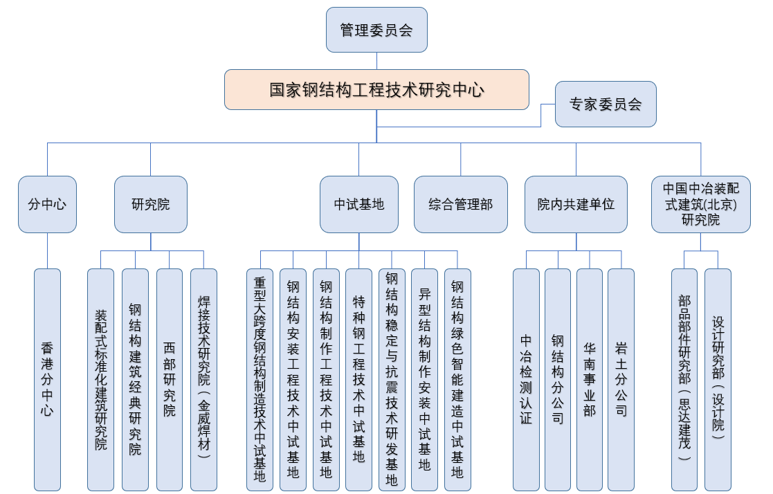 鋼結構中心的組織機構主要包括1個實體管理部門,1個分中心,4個研究院,7個中試基地,4家院內共建單位,1個中國中冶研究院。這些分中心、研究院、中試基地的建成使鋼結構中心與本領域的知名企業(yè)、學校、研究機構建立了緊密長期的合作關系,在鋼結構工程技術領域的研發(fā)、中試及生產任務中發(fā)揮著重要作用,有力地推動了新技術、新產品的產業(yè)化進程。
