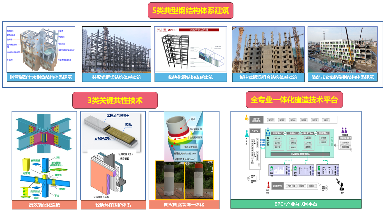 (1)鋼結構建筑產業(yè)化關鍵技術:研發(fā)了剪力墻、框架、模塊化、板柱結構和交錯桁架等5類典型鋼結構體系建筑產業(yè)化集成技術,重點突破了鋼結構建筑產業(yè)化需重點突破的高效裝配化連接、輕質環(huán)保圍護體系、防火防腐裝飾一體化3類關鍵共性技術,開發(fā)了全過程、全專業(yè)協同一體化智能建造技術平臺。